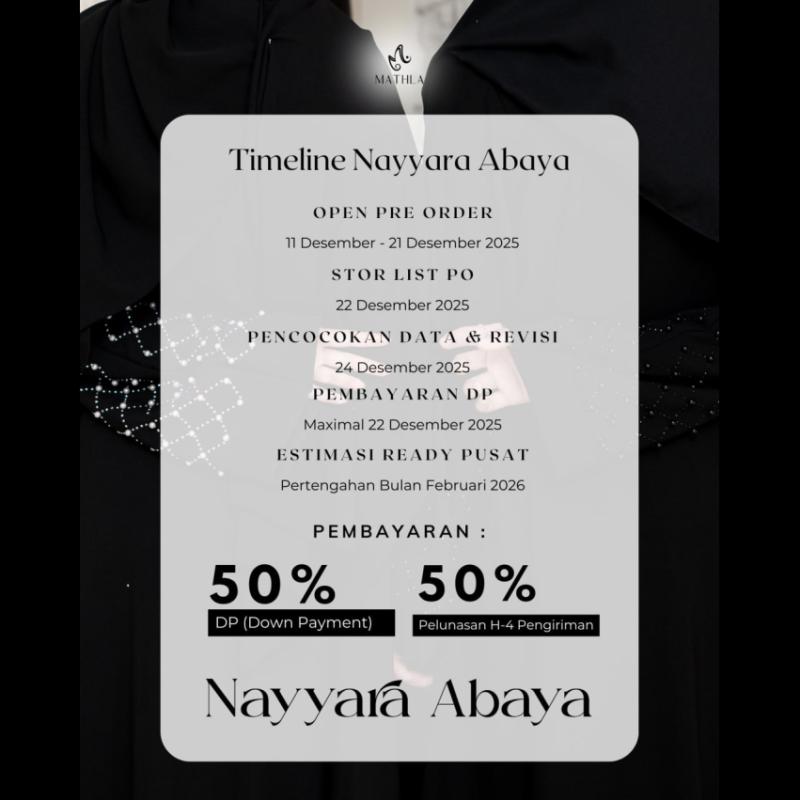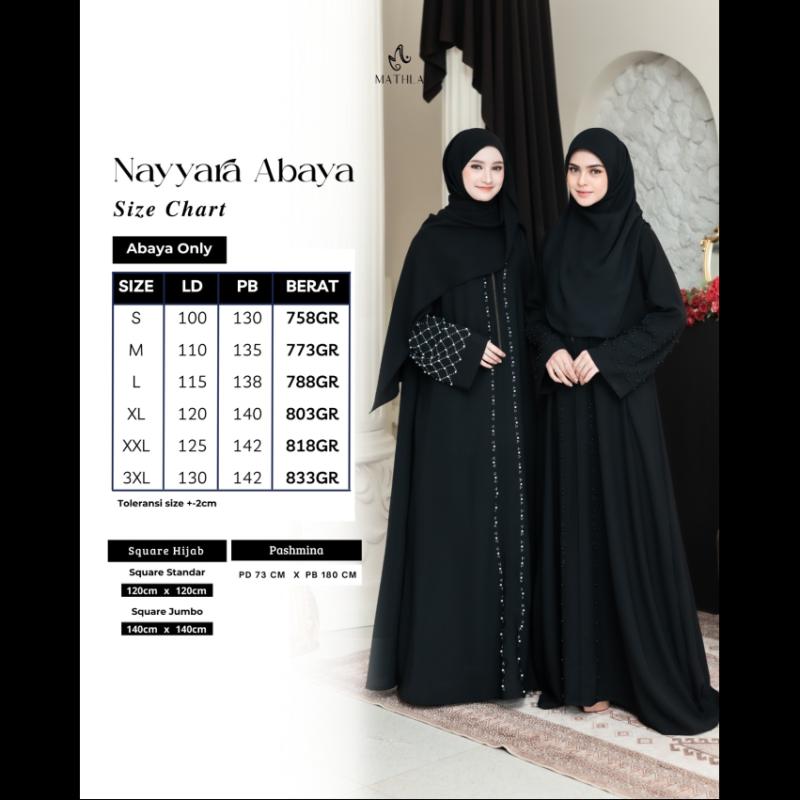 Bismillahirrahamannirrahim.. OPEN ORDER NAYYARA ABAYA by MATHLA • 5 warna cantik masing masing terdapat 2 pilihan mutiara (black dan white) ✨ BLACK ✨ MAROON ✨ MAHOGANY ✨ SPRUCE ✨ BROKEN WHITE Spesifikasi: Nayyara Abaya Series menggunakan bahan Sabrina ( Lembut, jatuh, adem, nyaman digunakan) * Abaya menggunakan resleting besi premium tebal * ⁠Cutting lebih besar dari size standar karena abaya tapi tetep menyesuaikan tubuh masing-masing * ⁠Terdapat payet dan mutiara cantik di beberapa bagian Abaya * ⁠Lengan loose * Saku samping Pashmina menggunakan bahan yang sama yaitu bahan Sabrina Square oval menggunakan polly catton . . Notes : - Perbedaan size +-2cm karena cutting massal - ⁠Perbededaan warna bisa terjadi karena perbedaan cahaya - Khusus warna BW wajib memakai daleman karena sedikit menerawang Keterangan size, harga ada di foto ya Dear✨